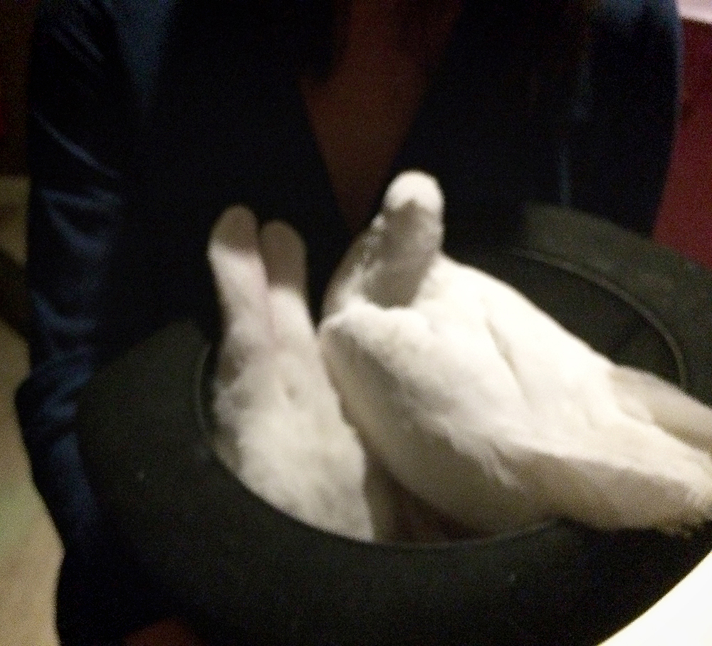 After dinner a few of us kept the party going at the hotel bar. All of a sudden, Christina (my almost sister-in-law) comes running around the corner to me screaming "there's a bunny on the dance floor". Without hesitation, I ran over and there he was - a white rabbit hopping around all by its lonesome. Long story short, there was a magic show earlier and as the magician was packing up, he let the rabbit roam around. Did we ask to pick him up? Uhh, of course! That's when we found out there was a dove, too. And they were friends. So without further ado, meet Cotton and Peter! (I'm not gonna lie, I completely forgot the dove's name so I made this one up and for some reason Peter seemed fitting). And yes, they're sitting in a black top hat.