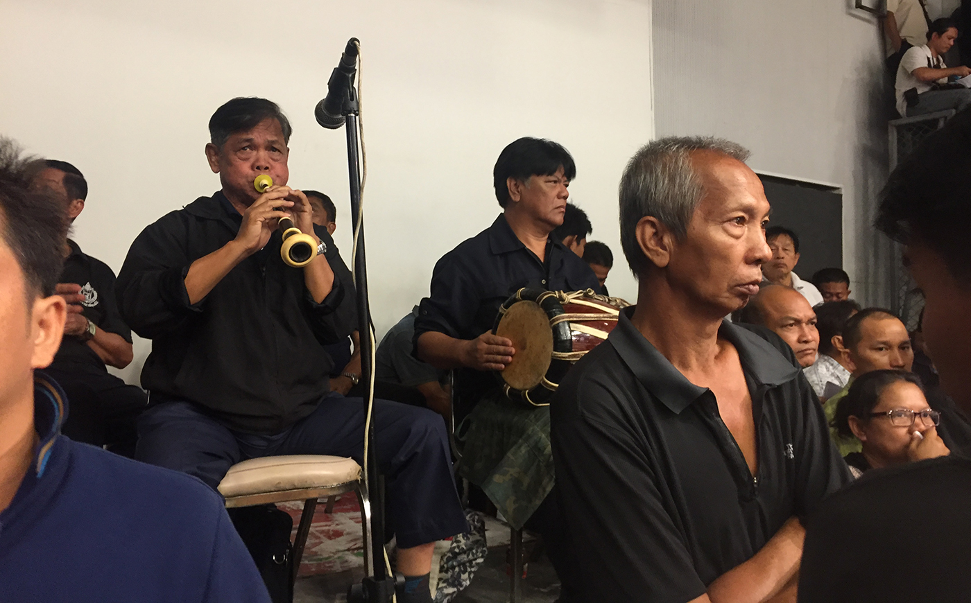 The beginning of each fight started with what appeared to be some sort of ritual. The fighters would stretch, pray and bow in certain directions, then they would kneel down and sweep the ring with their arms in a rhythmic fashion... it was actually quite graceful. They would do this as the arena "band" kept a steady beat and performed a chant-like melody that continued and intensified as punches were thrown and kicks were landed.